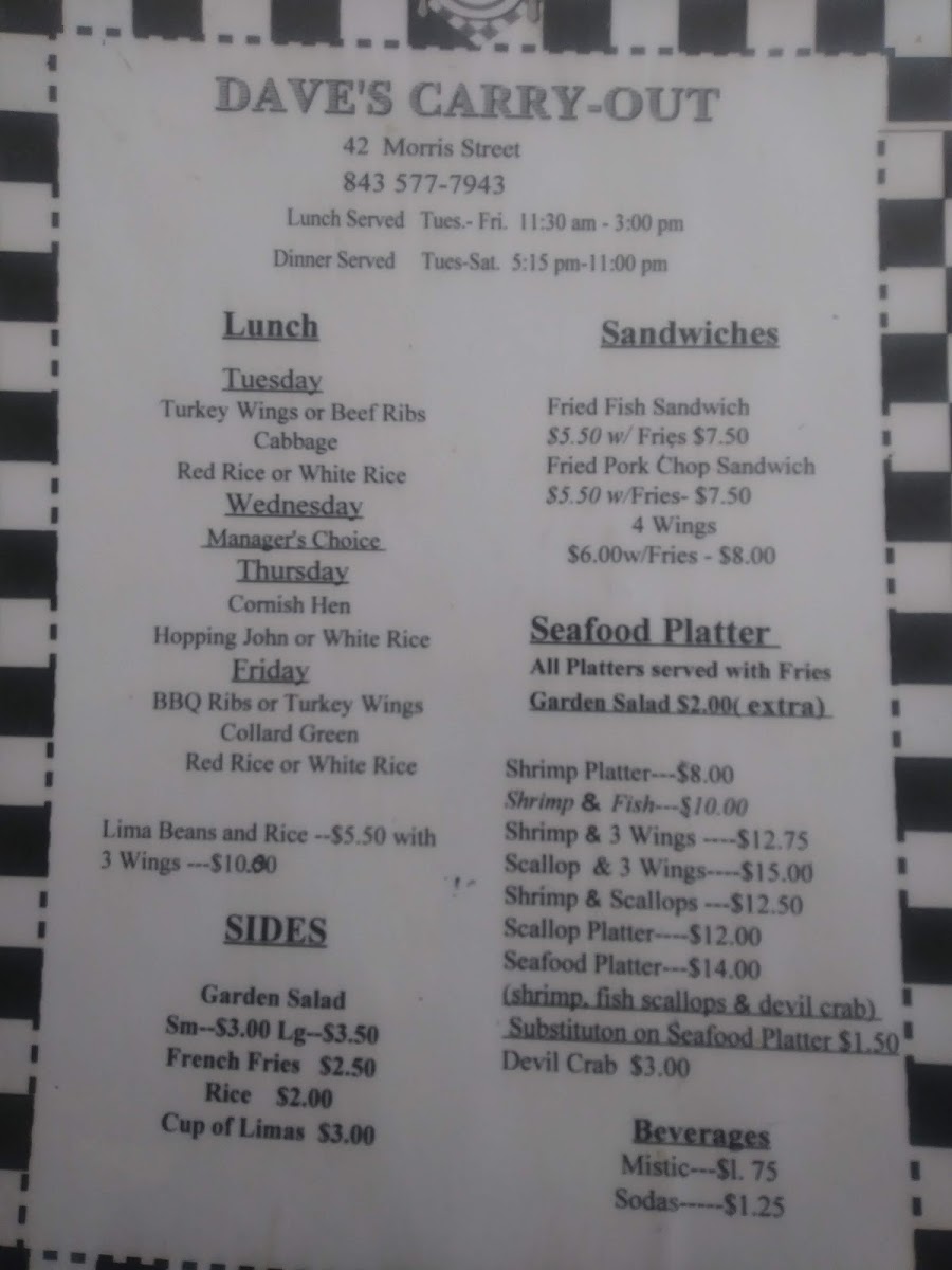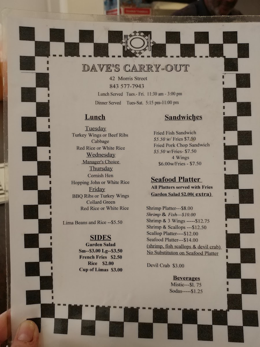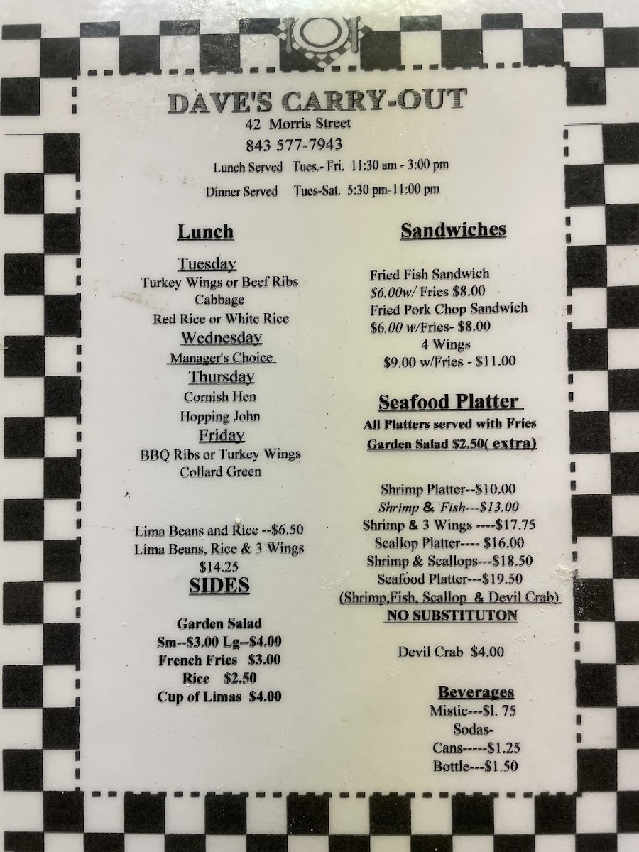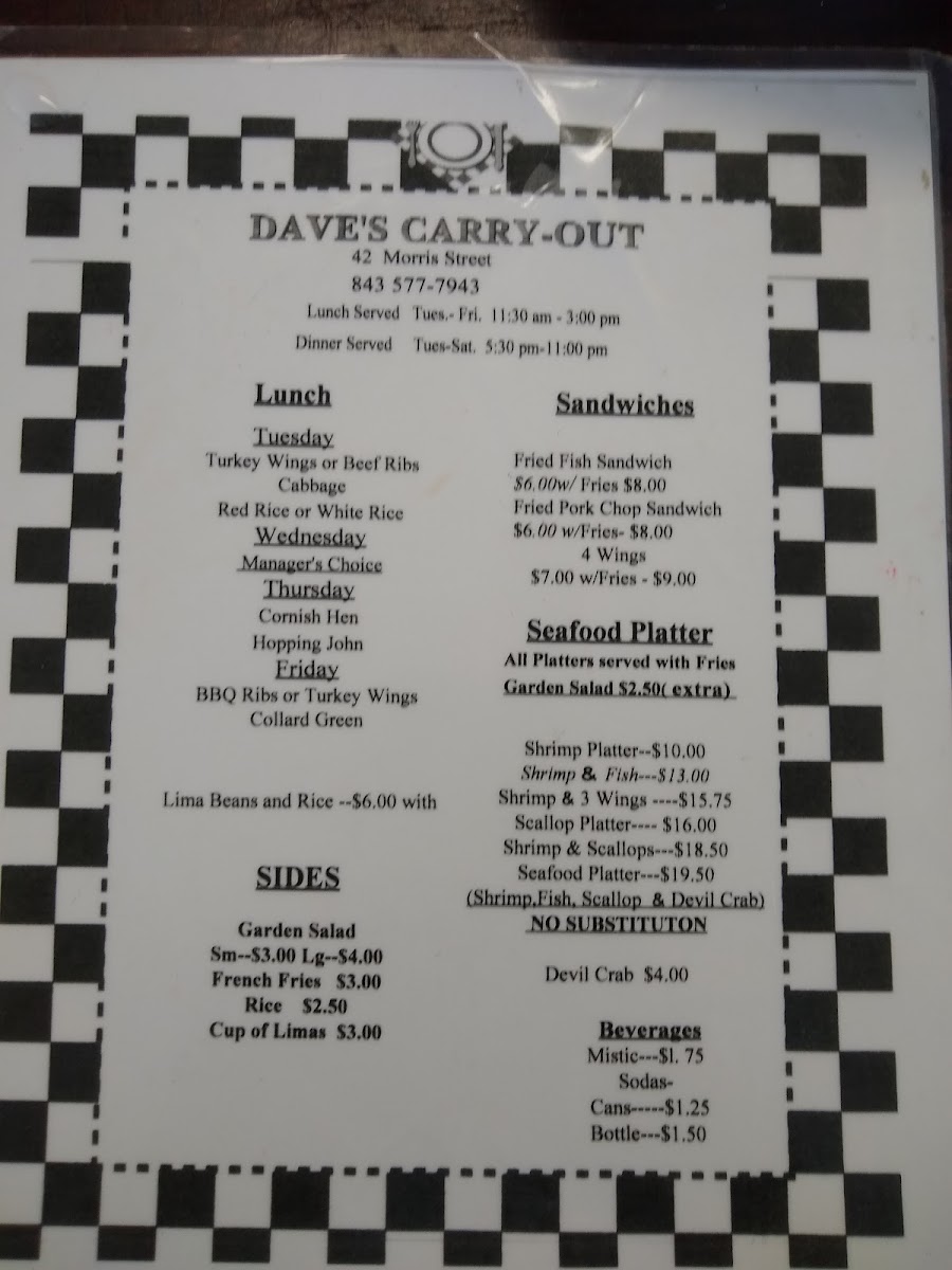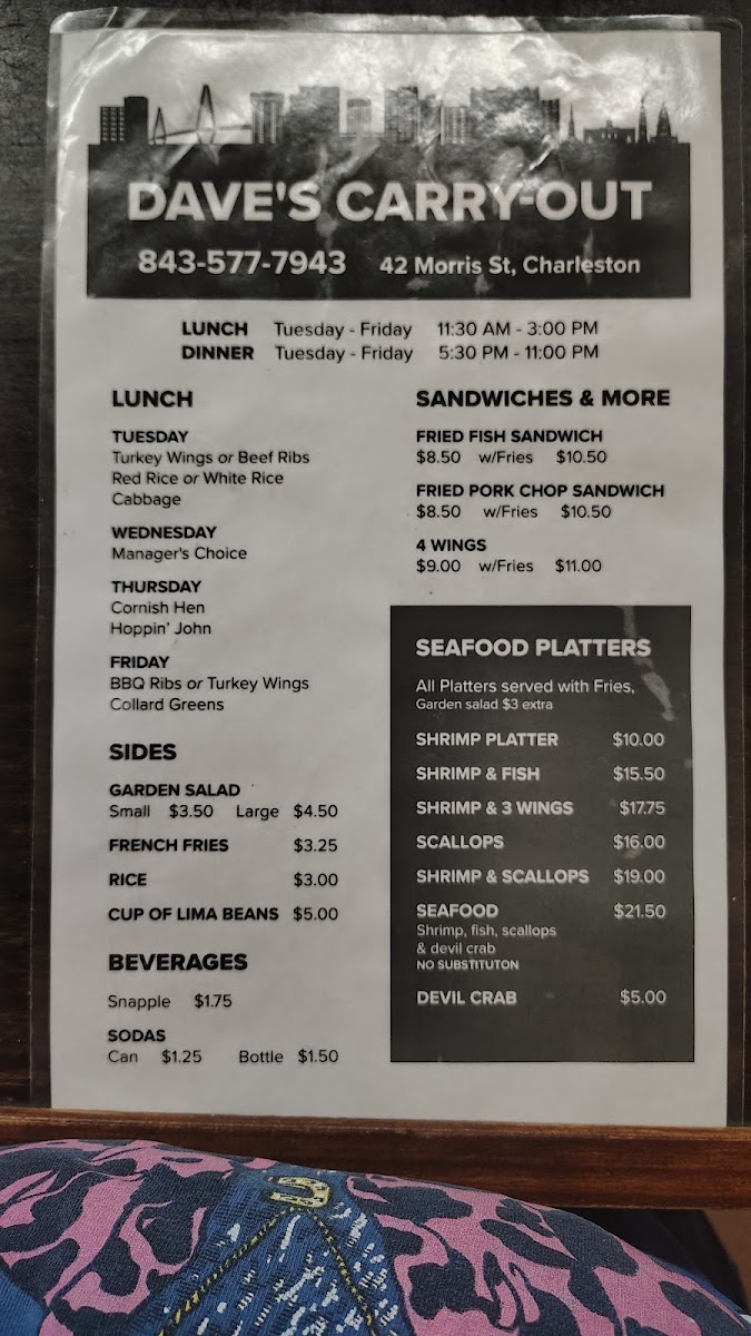 Welcome to Dave's Carry-Out, where we invite you to dive into a culinary journey brimming with local favorites and mouthwatering specialties! Nestled in the heart of Charleston at 42 Morris St C, our menu features a tantalizing array of dishes that are sure to please every palate. Whether you're craving the savory Shrimp & 3 Wings combo or the hearty Pork Chop Sandwich, every bite is crafted to perfection. Don’t miss our crowd-pleasers like the Devil Crab or the Fried Fish Sandwich, each promising a celebration of flavors. For those looking for a substantial entrée, our Beef Rib Lunch served with red rice and lima beans or the Shrimp and Scallop Platter will surely satisfy. Come explore the best of low-country cuisine with us – we can’t wait to serve you!