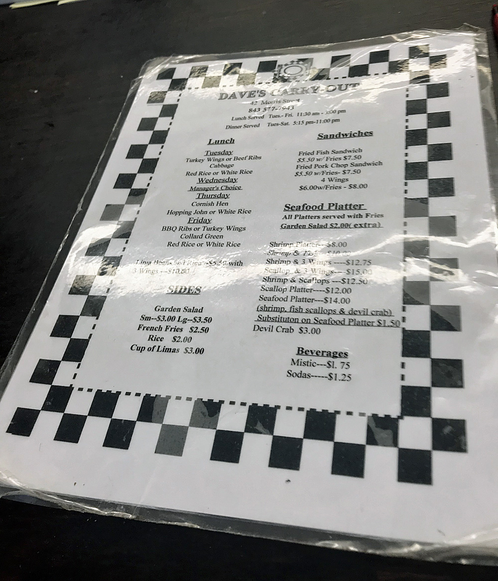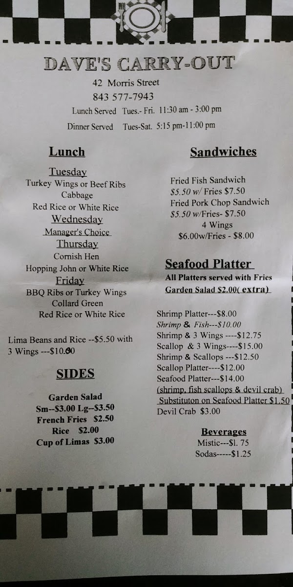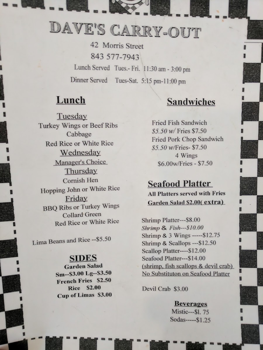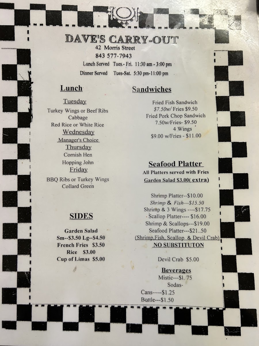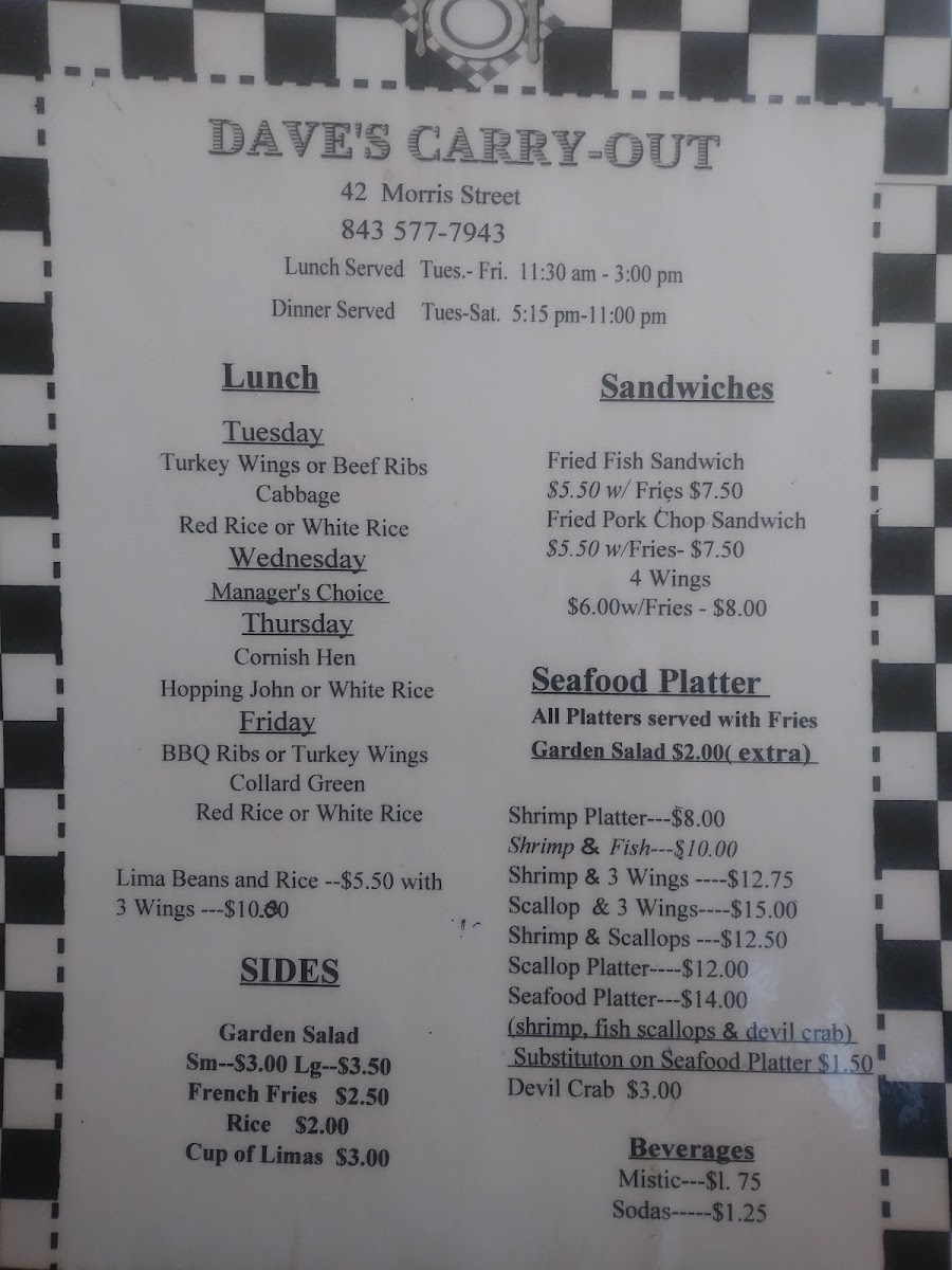 Welcome to Dave's Carry-Out, where we invite you to dive into a culinary journey brimming with local favorites and mouthwatering specialties! Nestled in the heart of Charleston at 42 Morris St C, our menu features a tantalizing array of dishes that are sure to please every palate. Whether you're craving the savory Shrimp & 3 Wings combo or the hearty Pork Chop Sandwich, every bite is crafted to perfection. Don’t miss our crowd-pleasers like the Devil Crab or the Fried Fish Sandwich, each promising a celebration of flavors. For those looking for a substantial entrée, our Beef Rib Lunch served with red rice and lima beans or the Shrimp and Scallop Platter will surely satisfy. Come explore the best of low-country cuisine with us – we can’t wait to serve you!